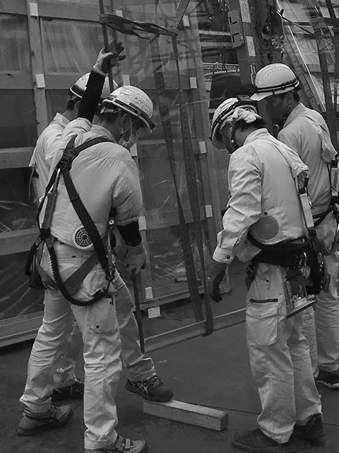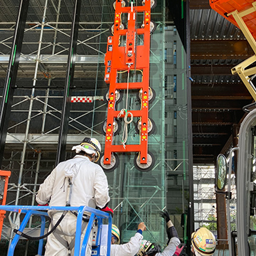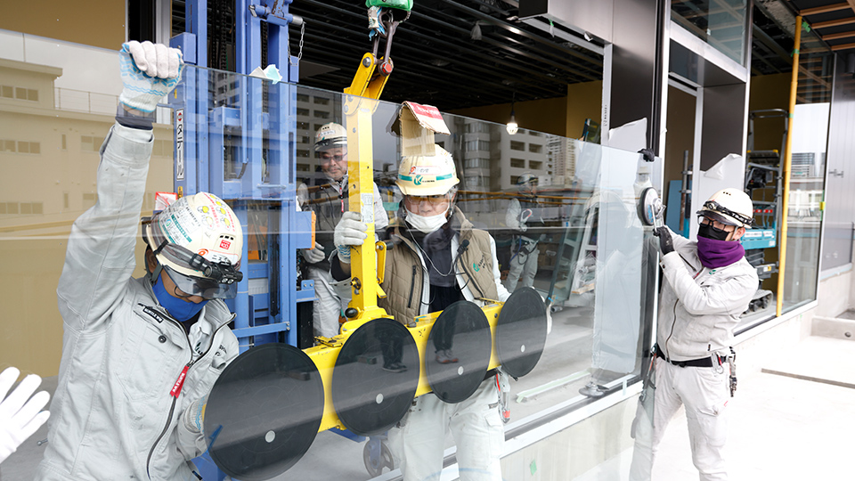 ただ、この時に学んだのは、当社のガラス工事業は必ず生き残れるということ。ユニット化されたのは同じガラスを大量に使用する部分のみで、形状やサイズが特殊な窓ガラスの場合は、現場で1枚ずつ施工しなければなりません。ですので、この仕事は残っていきます。また、商業施設には8mや10mという大型ガラスで、1枚あたり数tもする重さのガラスが使われており、海外でユニット化したものを輸送すると割れるリスクが高いため、日本のガラス工事業者が施工する状況がこの先も続くはずです。デザイン性の高い建物の場合、ガラスの形状が1枚ずつ異なる設計がされるケースもあります。現場で1枚ずつ施工する仕事はなくならないわけですから、その仕事を受注できるよう、当社のガラス事業は、工事の技術力を磨き続けます。
